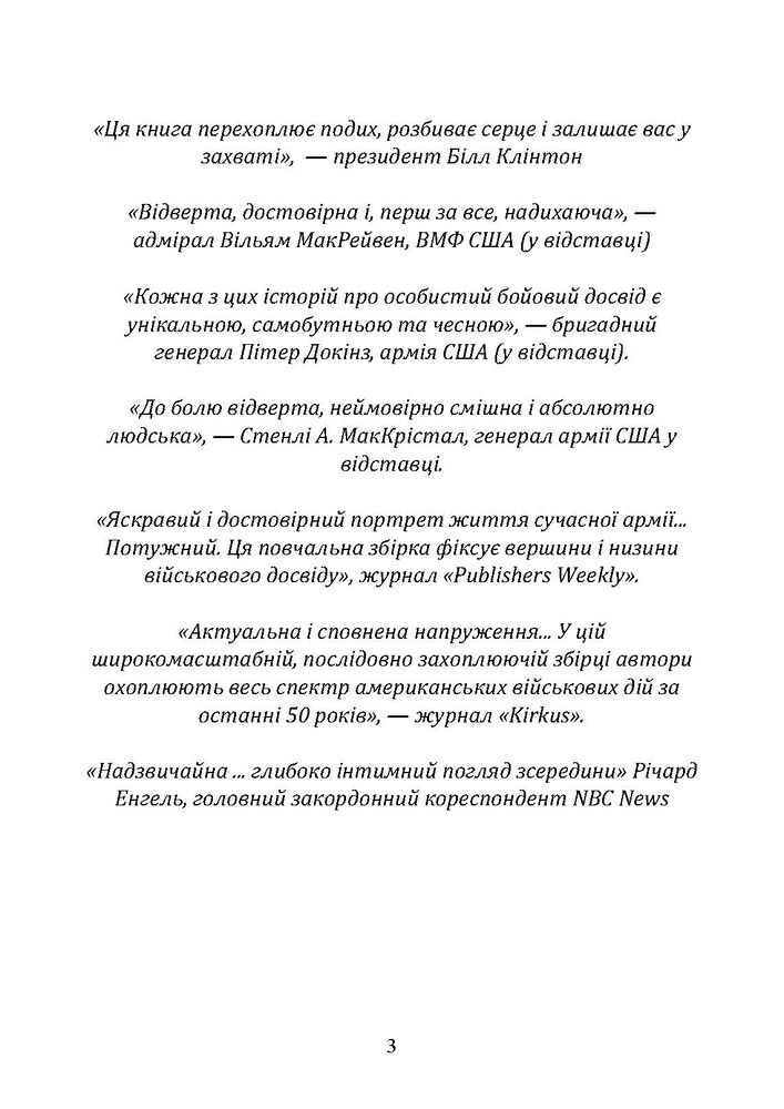 Це жорстоко чесні історії, якими зазвичай діляться лише товариші по зброї. Тут, у голосах чоловіків і жінок, які воювали за кордоном, від В’єтнаму до Іраку та Афганістану, можна побачити, як насправді носити форму, воювати, втрачати друзів і повертатися додому. Читачі, які наступного разу подякують військовослужбовцям за їх службу, нарешті зрозуміють, за що ця подяка.