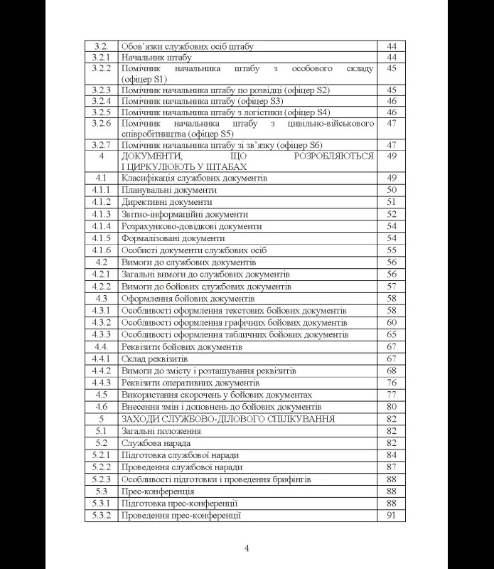 Окремі розділи присвячені службово-діловому спілкуванню, підготовці та проведенню нарад, брифінгів, пресконференцій, а також застосуванню електронних презентацій у діяльності штабу. Ґрунтовно висвітлено військовий процес прийняття рішення, етапи планування бойових дій, особливості організації бою в умовах обмеженого часу та управління підрозділами під час оборонних і наступальних дій, маршу, перевезення й розташування на місці.