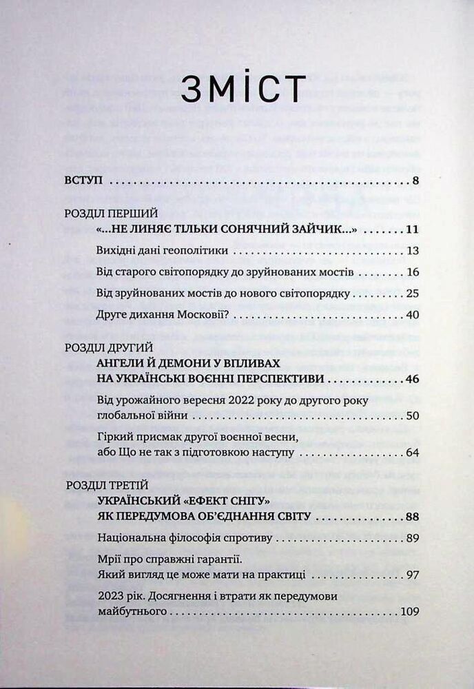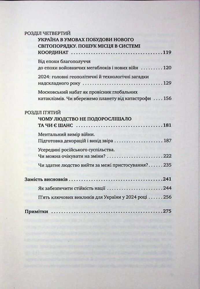 Книжка торкається всіх аспектів російської війни 2022—2024 років: від оцінок суто військового досвіду до філософського й психологічного розтинів. У ній автори намагаються переосмислити й усвідомити, як жити далі вже з наявною в новітній історії людства російсько-українською війною, для чого проводять синтетичний аналіз буття світу в міленіумі зі спробою одночасно зазирнути в минуле та майбутнє, діляться своїм поглядом на події у світі і країні й дають власні відповіді на цілу низку важливих та цікавих запитань, серед яких: