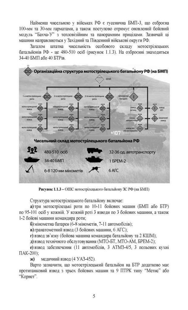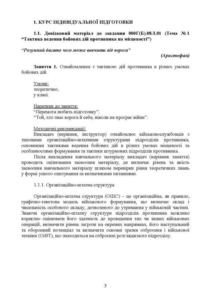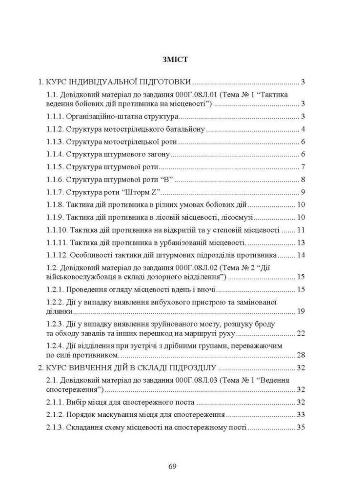 Зокрема в курсі висвітлено необхідні знання щодо тактики дій противника в різних умовах бойових дій. Розкрито організаційно-штатну структуру ворожого військового формування; структура мотострілецького батальйону; мотострілецької роти; штурмового загону; штурмової роти; штурмової роти “В” та роти “Шторм Z”. Також наведено тактику дій противника в різних умовах бойових дій; в лісовій місцевості, лісосмузі; на відкритій та у степовій місцевості, в урбанізованій місцевості й особливості тактики дій штурмових підрозділів противника.