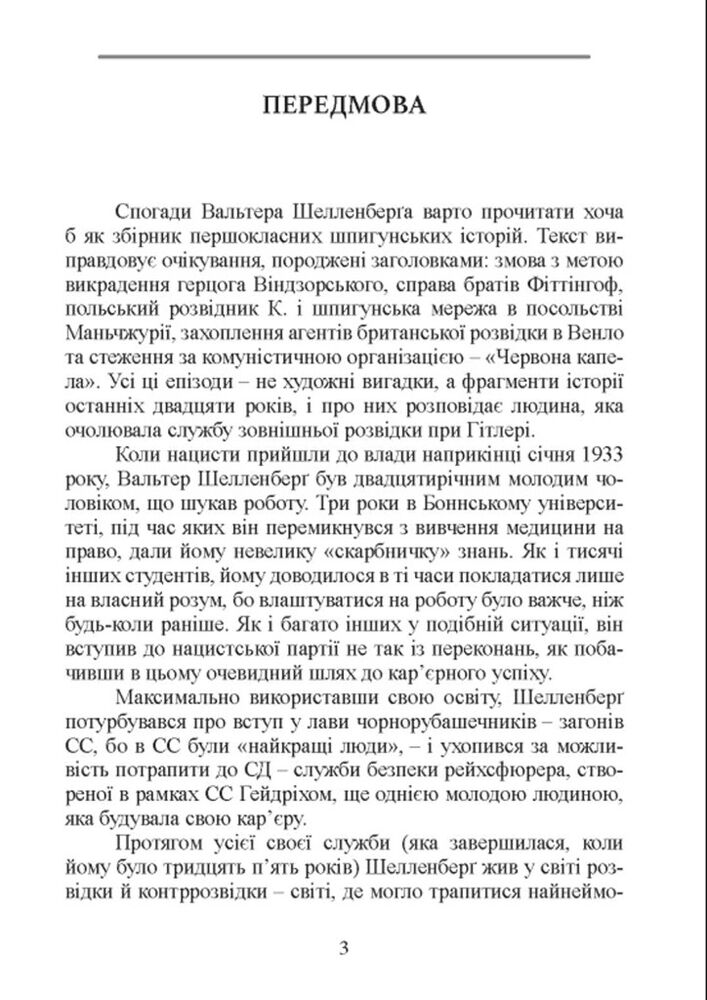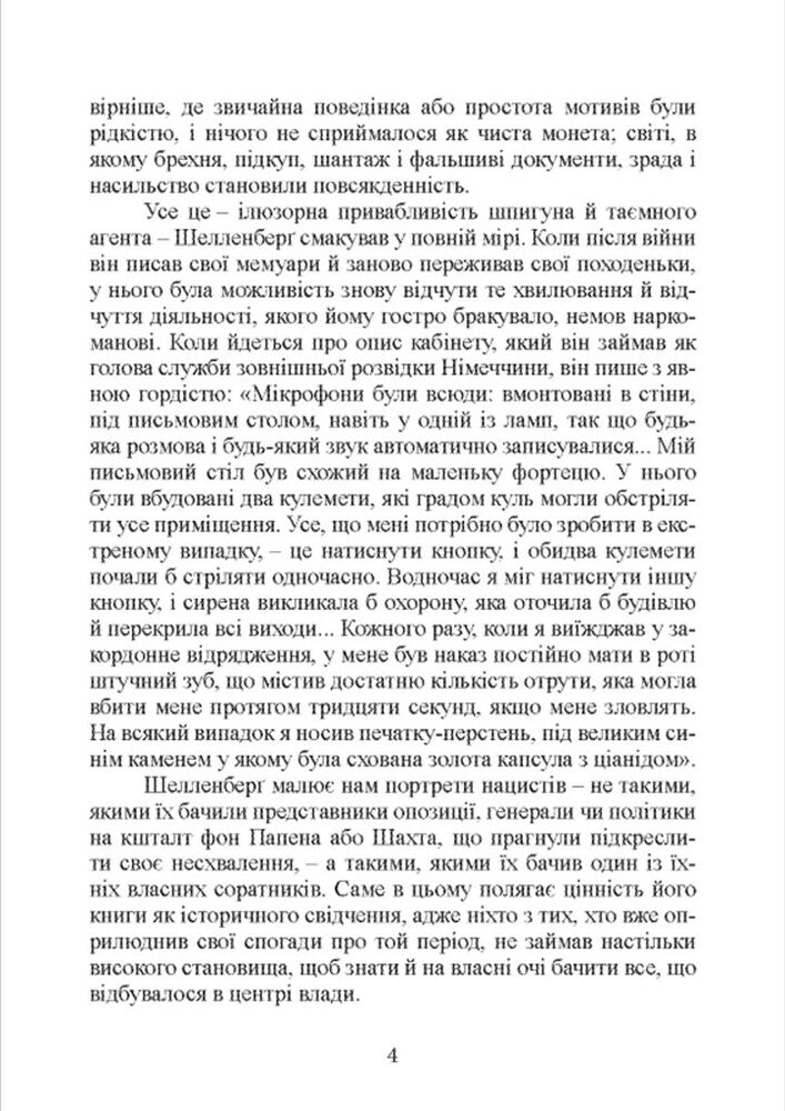 Спогади Вальтера Шелленберга, начальника зовнішньої розвідки служби безпеки Третього рейху, — це опис реальних подій, у яких він брав безпосередню участь або про які отримував відомості з перших рук. Справа Зорге, змова з метою вбивства Сталіна, історія операції «Цицерон», розповідь про особисте життя Гітлера, Гіммлера, Герінга і Гейдріха, операція «Цеппелін», «Червона капела» та багато інших інтригуючих таємниць нацистської розвідки аж до краху Третього рейху Шелленберг описав без прикрас, не прагнучи до самовиправдання, радше знову переживаючи відчуття володіння владою та власної значущості.