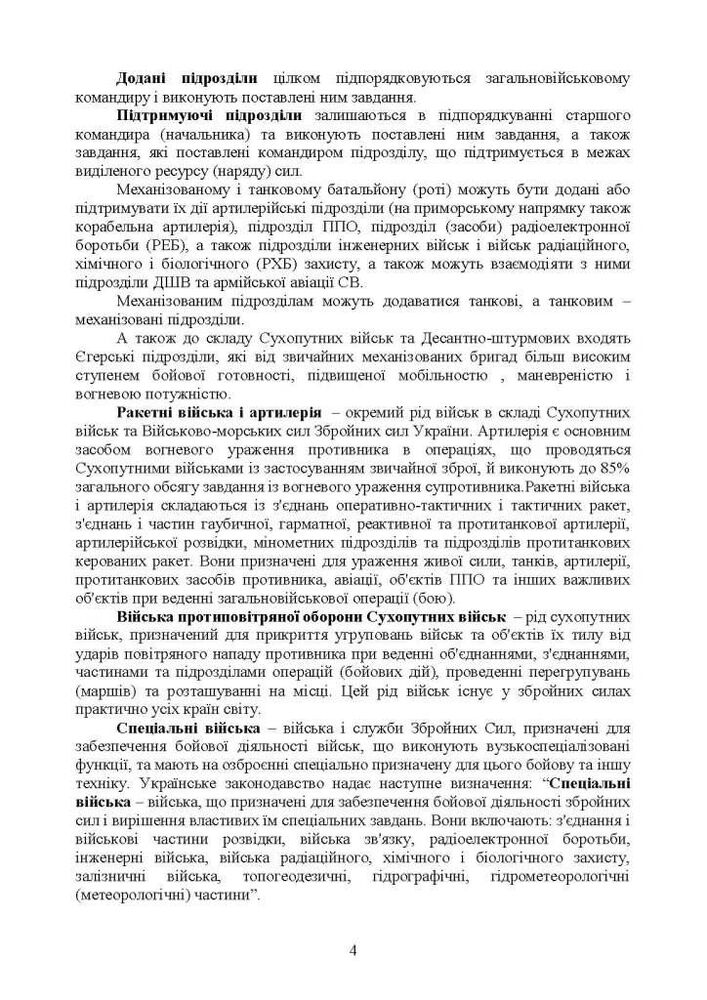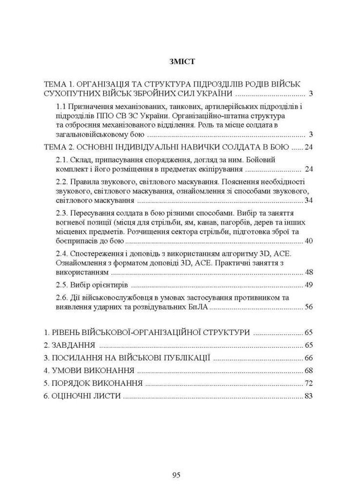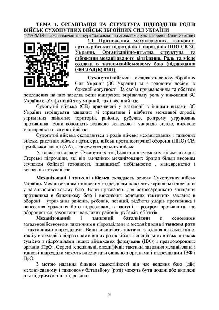 Зокрема в курсі висвітлено необхідні знання щодо організації та структури підрозділів родів військ Сухопутних військ Збройних Сил України. Розглянуто призначення механізованих, танкових, артилерійських підрозділів і підрозділів ППО СВ ЗС України; організаційно-штатну структуру та озброєння механізованого відділення; роль та місце солдата в загальновійськовому бою. Визначено основні індивідуальні навички солдата в бою.