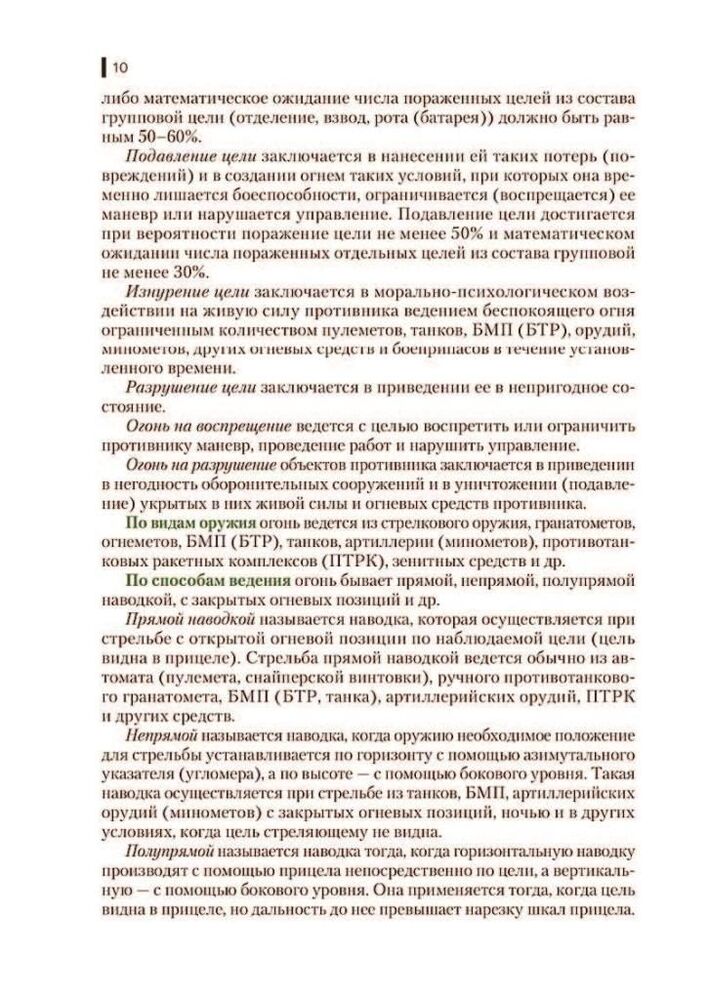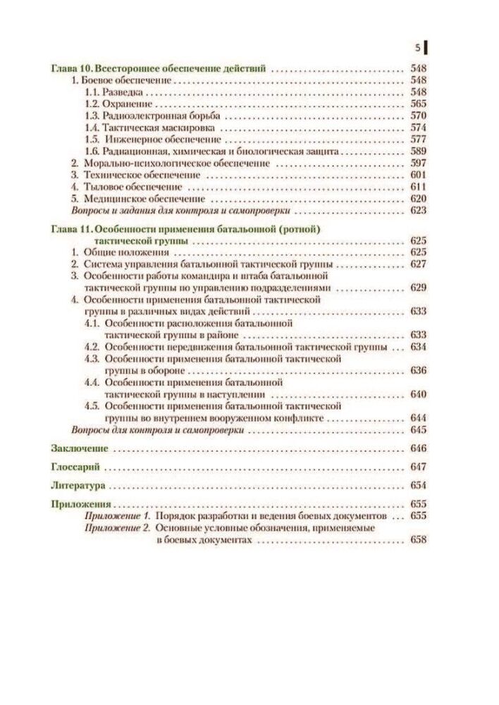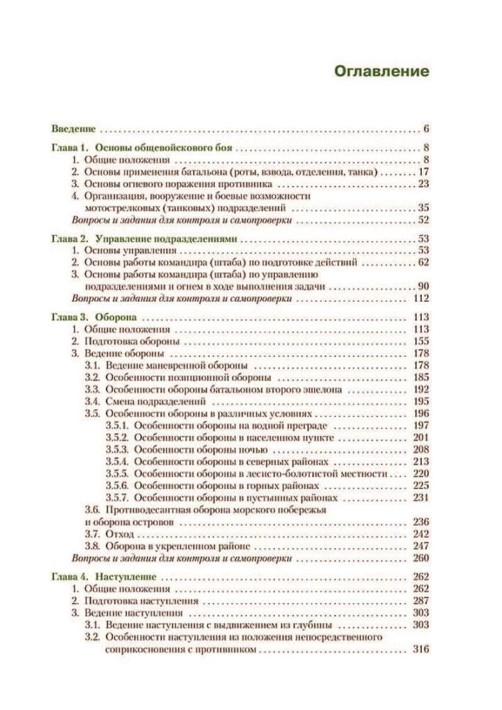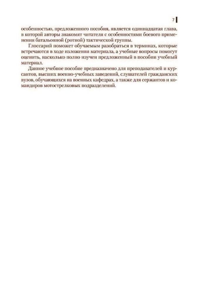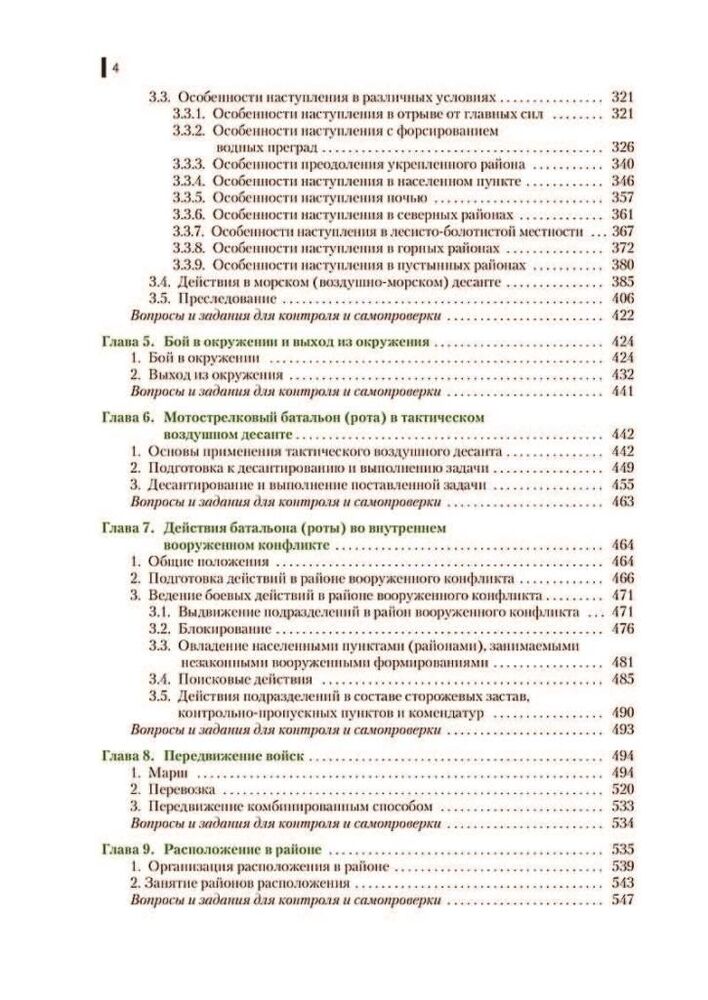 У ньому розглянуто як загальні положення, питання підготовки та ведення різних видів дій батальйоном, ротою, взводом та відділенням, так і питання всебічного забезпечення. До другої частини посібника включено розділ «Особливості застосування батальйонної (ротної) тактичної групи». Відповідає ФГОС у останнього покоління.