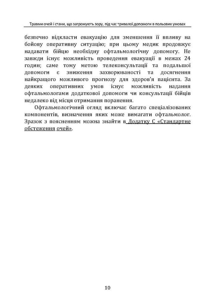 Дані настанови надають медичним працівникам основну інформацію щодо розпізнавання та проведення лікування захворювань очей в умовах затримки евакуації пораненого для надання спеціалізованої офтальмологічної допомоги.