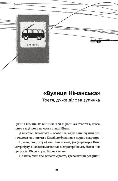 Щодня тролейбус їде вулицями Києва за своїм маршрутом. Кожна зупинка — це окрема розповідь, і йдеться не лише про історію київських вулиць та локацій. Книжка спогадів Наталки Діденко дає можливість зануритися в атмосферу Києва через призму особистих історій авторки. Ці прості й відверті, щемкі, теплі, сповнені доброго гумору розповіді немов переносять нас у минуле, дають можливість пригадати студентські роки й час дорослішання, зустрічі з друзями, маленькі радощі й великі досягнення. З часом змінюються назви вулиць, міняється темпоритм життя, врешті змінюємося ми самі, а тролейбус їде тим самим маршрутом і запрошує нас у мандрівку — в подорож у близьке минуле.