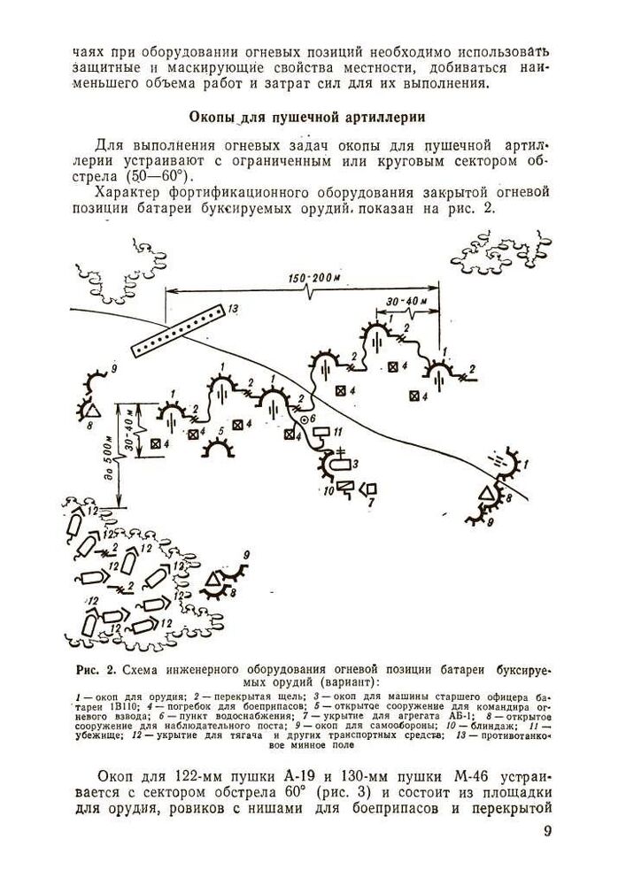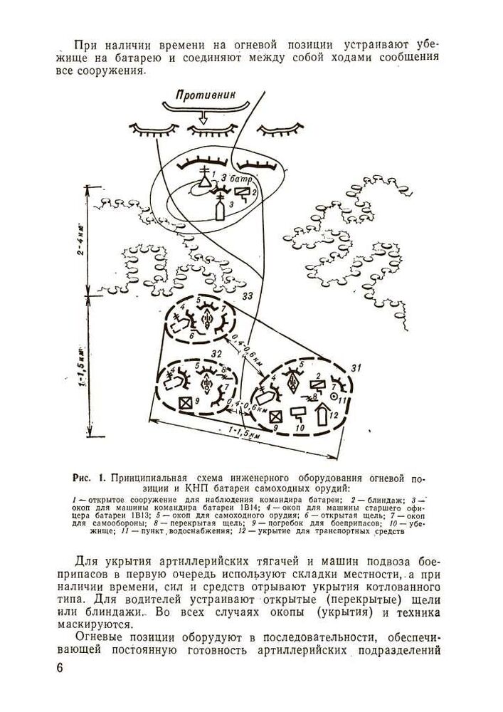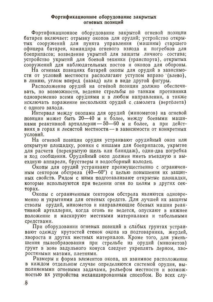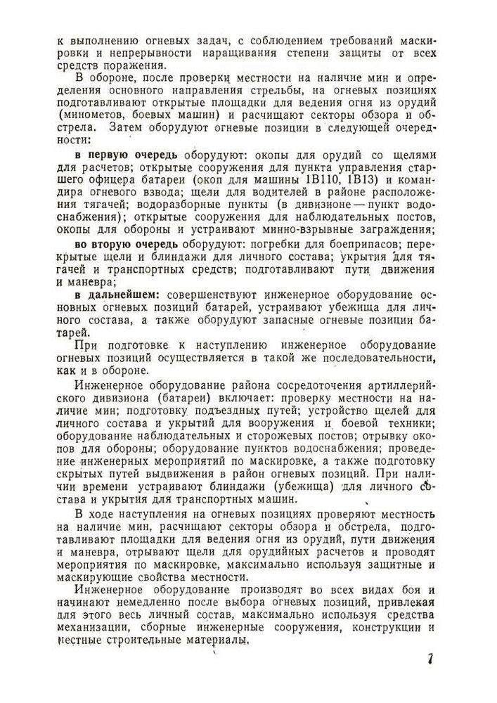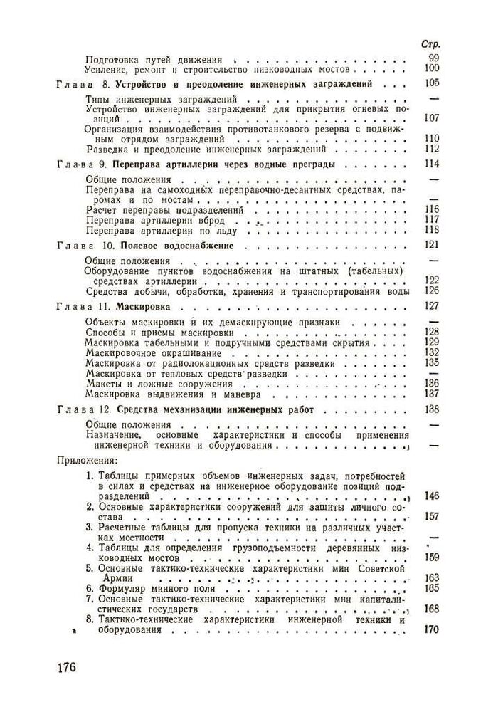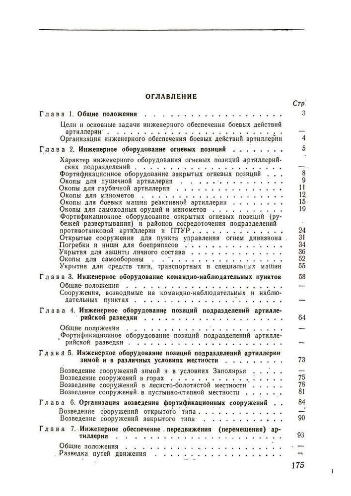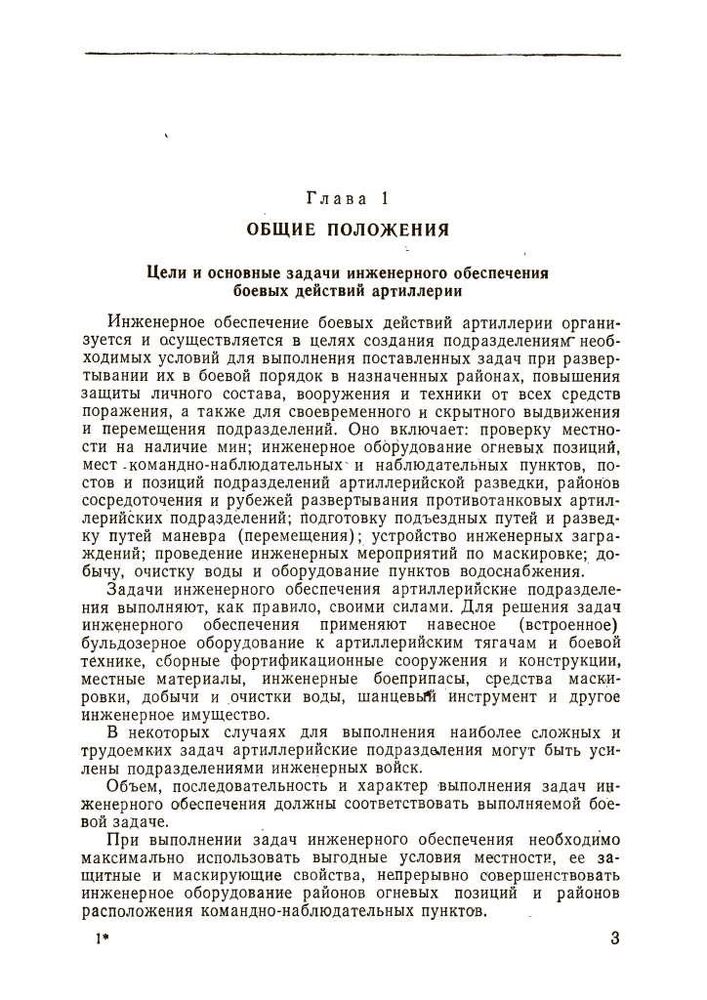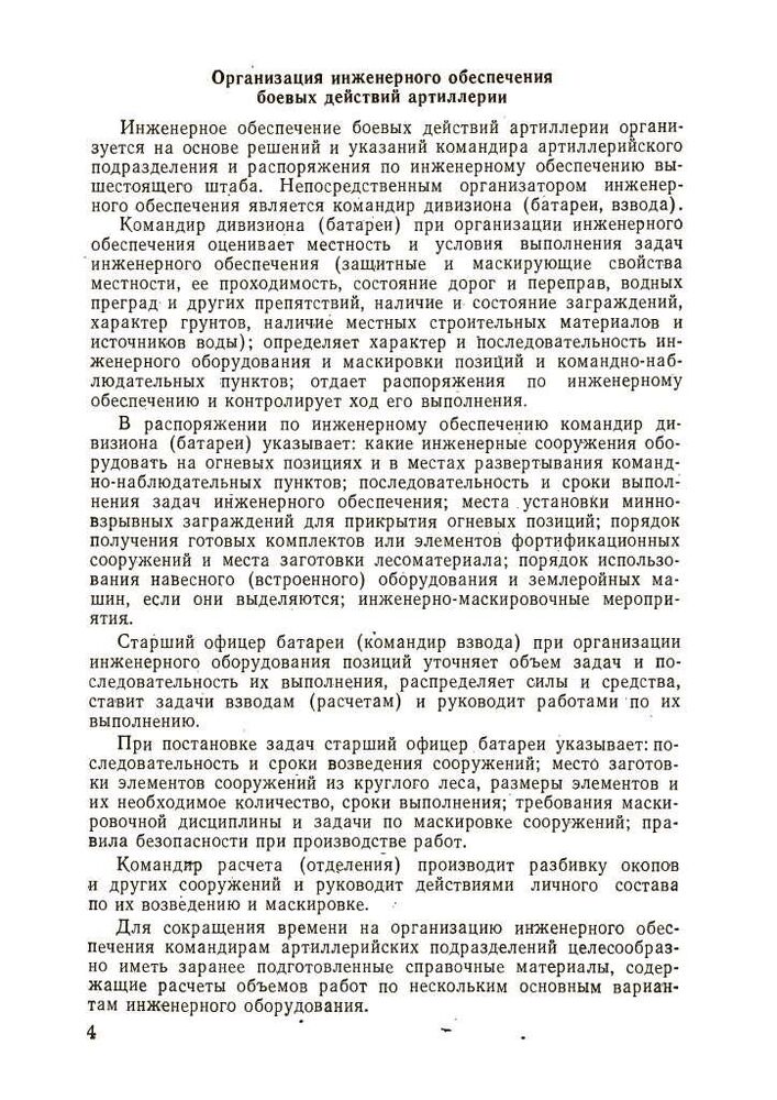 Ці вказівки містять основні положення щодо інженерного забезпечення бойових дій артилерії сухопутних військ. У них викладено питання фортифікаційного обладнання та маскування бойових порядків артилерійських підрозділів у різних умовах місцевості, надано практичні рекомендації щодо інженерного забезпечення пересування артилерії та переправи її через водні перешкоди, влаштування та подолання інженерних загороджень та забезпечення водою, а також наведено основні відомості про засоби .