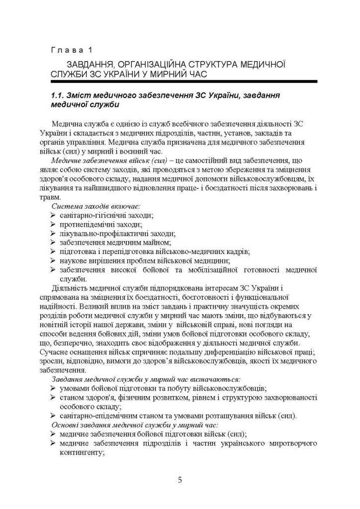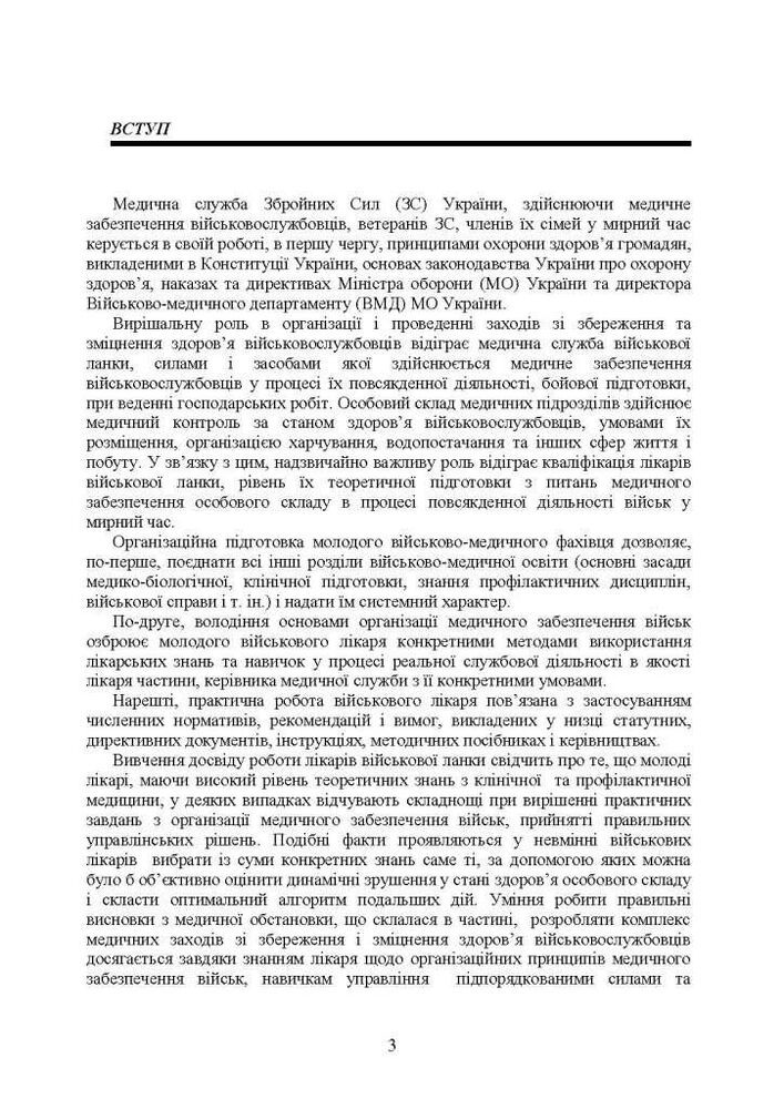 Підручник являє собою оригінальну працю, що містить системне викладення основних організаційних і методичних засад медичного забезпечення військ (сил) у мирний час. У підручнику подані практично всі основні напрямки діяльності медичної служби військової ланки у мирний час: завдання і організація діяльності медичної служби військової частини, організація та проведення лікувально-профілактичних заходів, завдання обладнання та облаштування функціональних підрозділів медичного пункту (медичної роти) полку (бригади), організація бойової підготовки особового складу медичної служби, організація санаторно-курортного лікування та військово-лікарської експертизи, організація та зміст роботи військового госпіталю як центру профілактичної і лікувально-діагностичної роботи в адміністративно- територіальній зоні відповідальності, прийом і здача справ та посади, порядок ведення службової документації та ін. Принципові положення підручника, щодо організації і методики заходів, що проводяться медичною службою у мирний час, можуть бути використані в практичній роботі лікарями військової ланки Збройних Сил України.