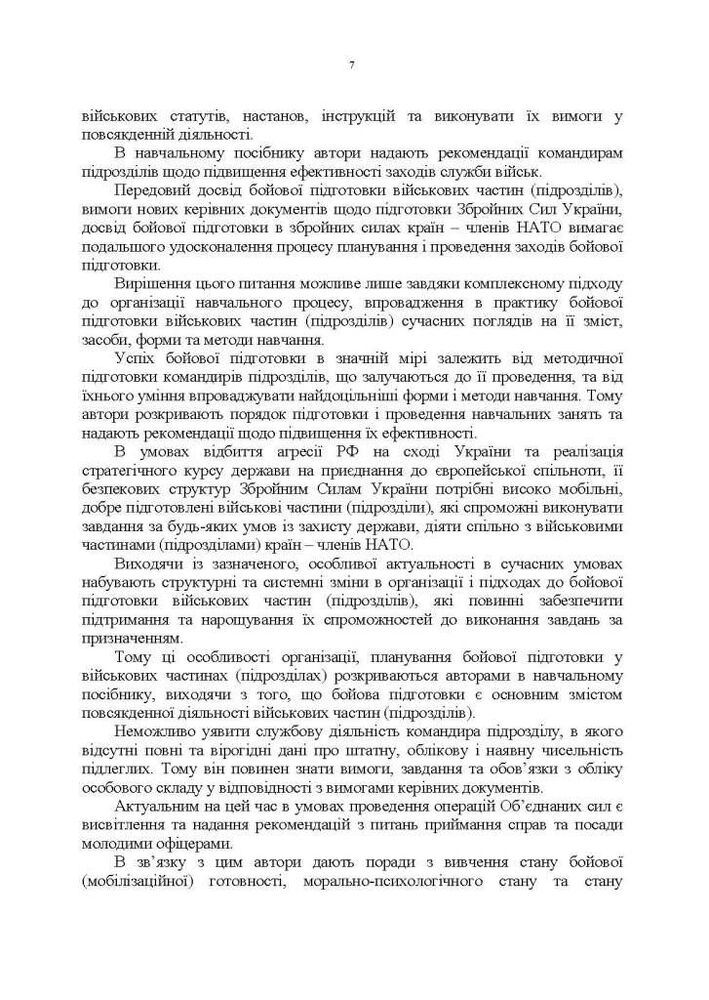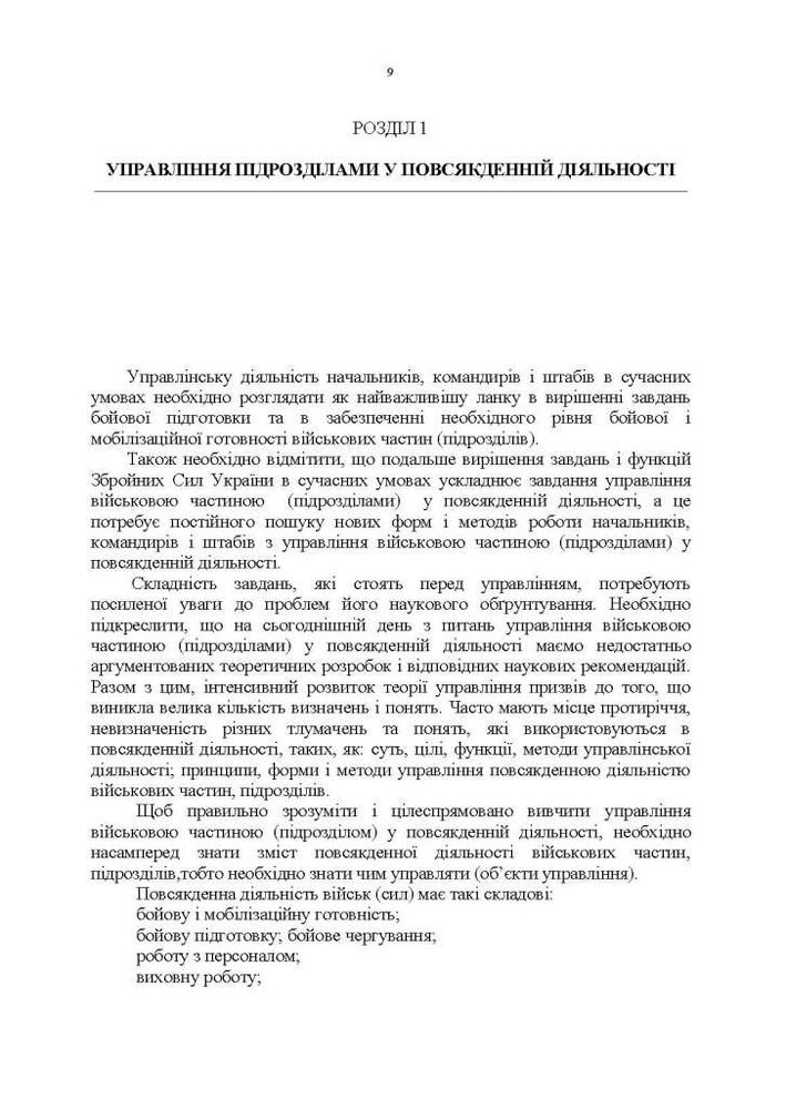 У навчальному посібнику відповідно до вимог керівних документів, стандартів НАТО та з урахуванням практичного досвіду військ (сил) під час проведення АТО, ООС з питань управління повсякденною діяльністю військових частин (підрозділів) викладено систематизовані основи та практичні рекомендації щодо управління повсякденною діяльністю підрозділів.