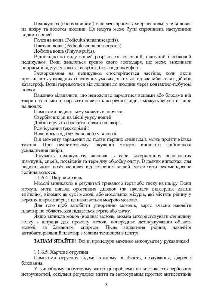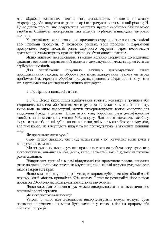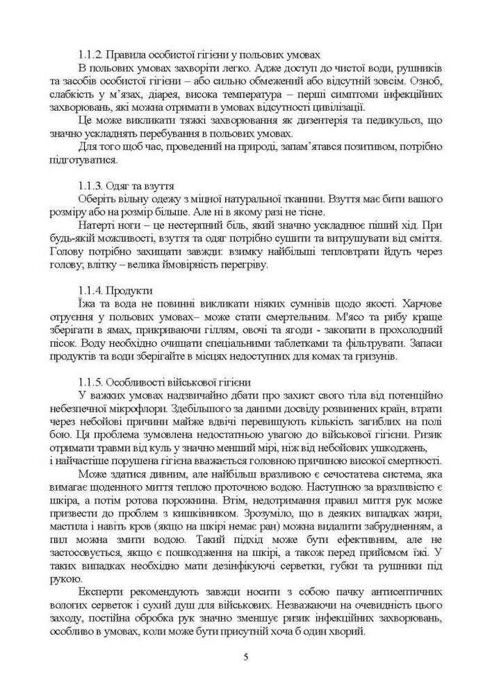 До даного курсу входить блок знань з забезпечення життєдіяльності та собистої гігієни військовослужбовця ЗСУ. Зокрема порядок організації побуту особового складу в районі розміщення (на позиції, в тиловій смузі, з урахуванням умов місцевості (лісиста, урбанізована, степова). Профілактичні заходи основних захворювань та запобігання поширених пошкоджень нижніх кінцівок.