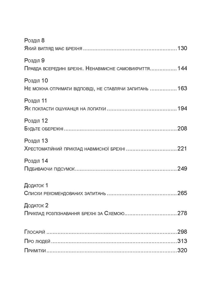 Перед вами практичний посібник із розпізнавання брехні, який читається як шпигунський роман! І не дивно: практики, ідеї, методи, описані тут, були відкриті не психологами в затишних кабінетах і університетських аудиторіях, а співробітниками ЦРУ під час допитів агентів іноземних розвідок і підозрюваних у тяжких злочинах. Автори цього приголомшливого посібника не вчені, а досвідчені практики, які десятиліттями вели очні ставки, вербували агентів і вистежували шпигунів. Вони навчилися відчувати брехню, бачити її, розуміти її суть. Із цих знань і спостережень за поведінкою людей, їхніх вербальних і невербальних сигналів виникла Система виявлення брехні. Систему багаторазово перевірено в ЦРУ і вона набула величезної кількості послідовників в інших сферах її шанувальниками стали співробітники юридичних фірм, великих корпорацій, фінансових компаній з Волл-Стріт. Черга за вами! Автори навчать вас віртуозно розпізнавати брехню колег, друзів, коханих і навіть власних дітей, а також розкажуть десятки історій неймовірних викриттів. Почавши читати, ви вже не зможете відірватися!