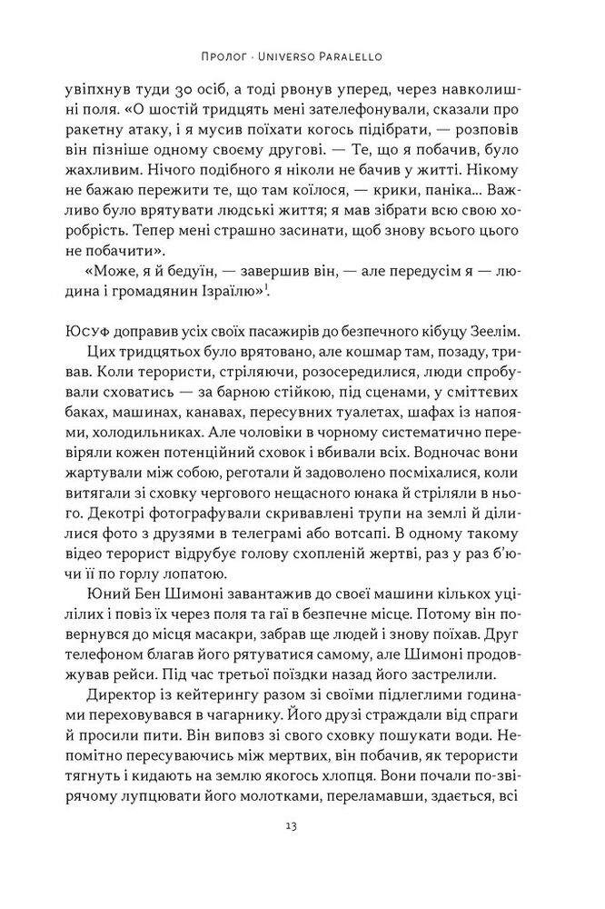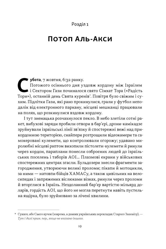 Автор описує героїзм простих ізраїльтян, вплітаючи особисті трагедії заручників; аналізує передумови катастрофічного провалу сил безпеки, які уможливили напад; оцінює дії Армії оборони Ізраїлю у відповідь — операцію «Залізні мечі». Перевагою книжки є глибоке дослідження історичного контексту арабо-ізраїльських відносин, щоб пояснити причини та масштаби конфлікту.
