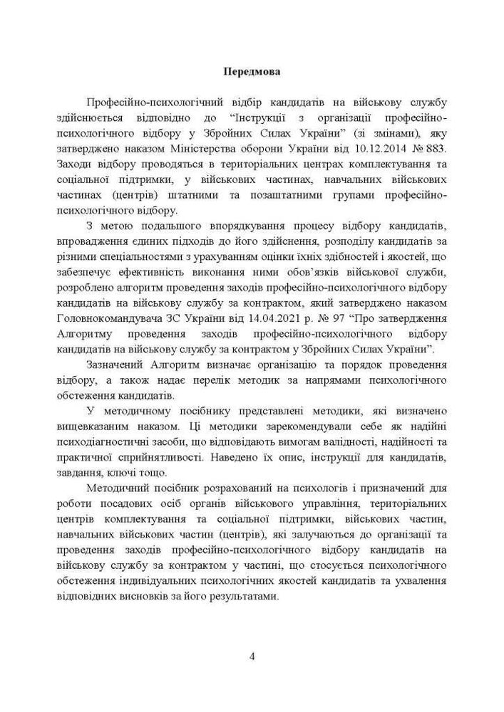 Методичний посібник містить психодіагностичні методики для професійно-психологічного відбору кандидатів на військову службу за контрактом, які затверджені для застосування у Збройних Силах України.