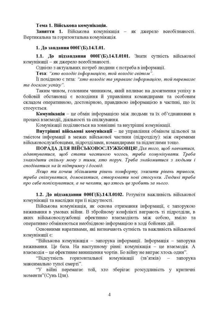 Зокрема в курсі висвітлено необхідні знання щодо: сутності військової комунікації; порядок роботи вертикальної та горизонтальної комунікації; основні способи зв’язку та вимоги до них; альтернативні способи зв’язку та порядок їх вибору при втраті основного зв’язку; тактичні сигнальні жести;засоби зв’язку, призначення, склад та основні технічні можливості портативних радіостанцій.
