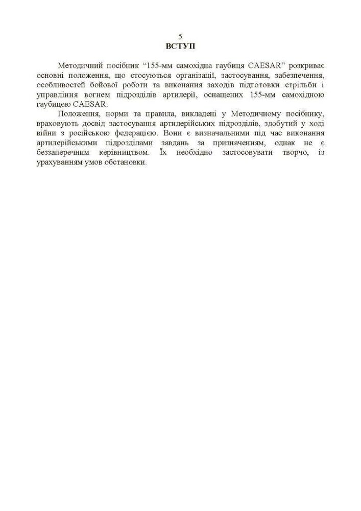 Методичний посібник “155-мм самохідна гаубиця CAESAR” розкриває основні положення, що стосуються організації, застосування, забезпечення, особливостей бойової роботи та виконання заходів підготовки стрільби і управління вогнем підрозділів артилерії, оснащених 155-мм самохідною гаубицею CAESAR.