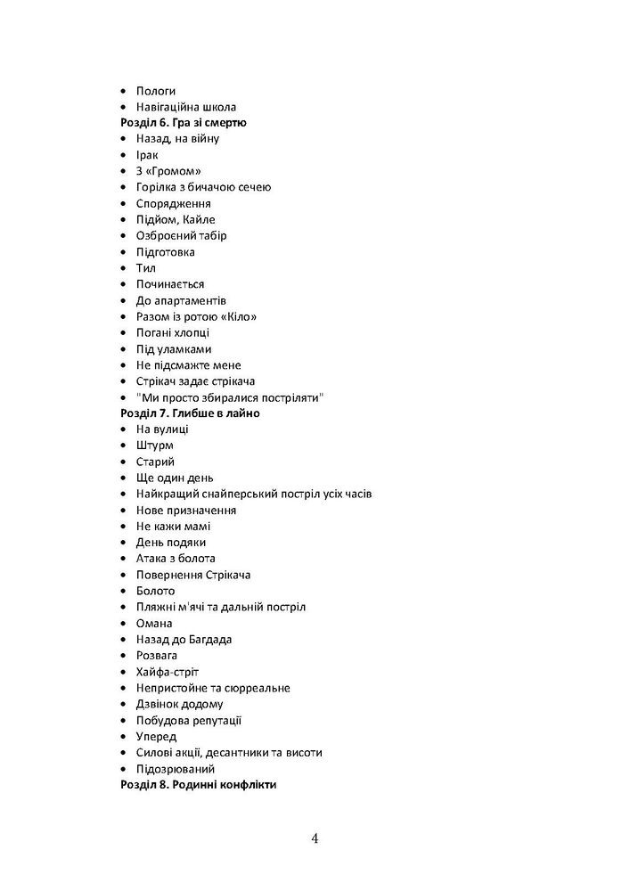 У своїй автобіографії Кріс Кайл докладно розповідає про службу в 3-му загоні SEAL і особисту участь у бойових операціях на території Іраку, про колег-снайперів та особливості снайперської роботи в умовах сучасної контртерористичної війни. Чимале місце він відвів також своєму особистому життю, зокрема стосункам із дружиною Таєю.
