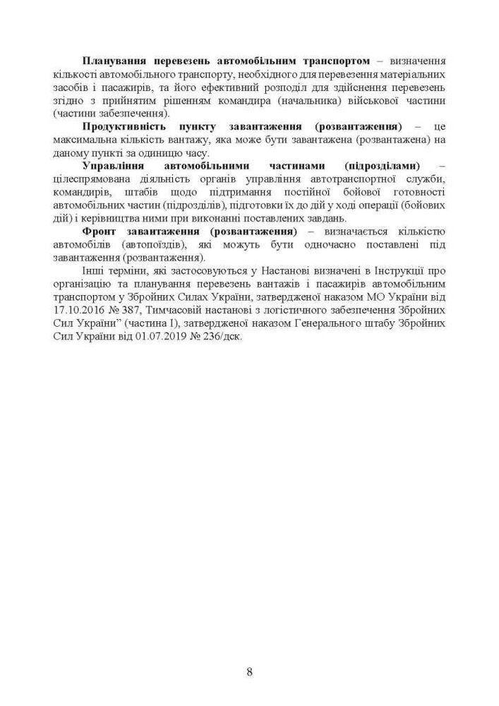 Это наставление определяет назначение, задание, порядок применения автомобильных военных частей, основные положения из организации осуществления перевозок автомобильным транспортом в Вооруженных Силах Украины при подготовке и в ходе операций (боевых действий) с учетом опыта осуществления военных перевозок полученного в ходе проведения Антитеррористической операции и операции Объединенных сил на территории Донецкой и Луганской областей (дальше - ООС (раньше АТО), реализации стратегического курса государства на приобретение полноправного членства Украины в Европейском Союзе и в Организации Североатлантического договора, активного участия Вооруженных Сил Украины в операциях (миссиях), Силах реагирования НАТО, многонациональных учебах при участии ержав-членів и государств-партнеров НАТО, а также реализации общей политики безопасности и обороны Европейского Союза.