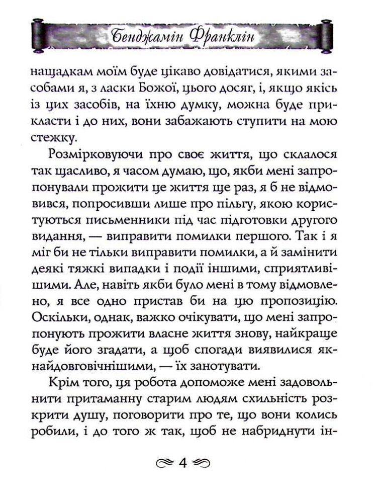 В предложенной книге Бенджамина Франклина, политического деятеля, писателя, ученого, издателя, одного из основателей Соединенных Штатов Америки, в автобиографической форме изложены те принципы, которые помогут каждому добросовестному человеку добиться жизненного успеха. Это, в частности, трудолюбие, умеренность, бережливость, сдержанность, справедливость, решительность, внутреннее равновесие, нравственная стойкость. Воплощая эти добродетели в жизнь, Бенджамин Франклин, даже терпя неудачи и разочарования, обычно преуспевал во всех своих делах и проектах: создании собственной типографии, издательстве и редактировании «Пенсильванской газеты», учреждении Филадельфийской публичной библиотеки и Филадельфийского университета. народного ополчения в борьбе за независимость Соединенных Штатов Америки, изобретении печи для обогрева зданий и совершенствовании фонарей уличного освещения, результативных научных экспериментов с электричеством и т.д.