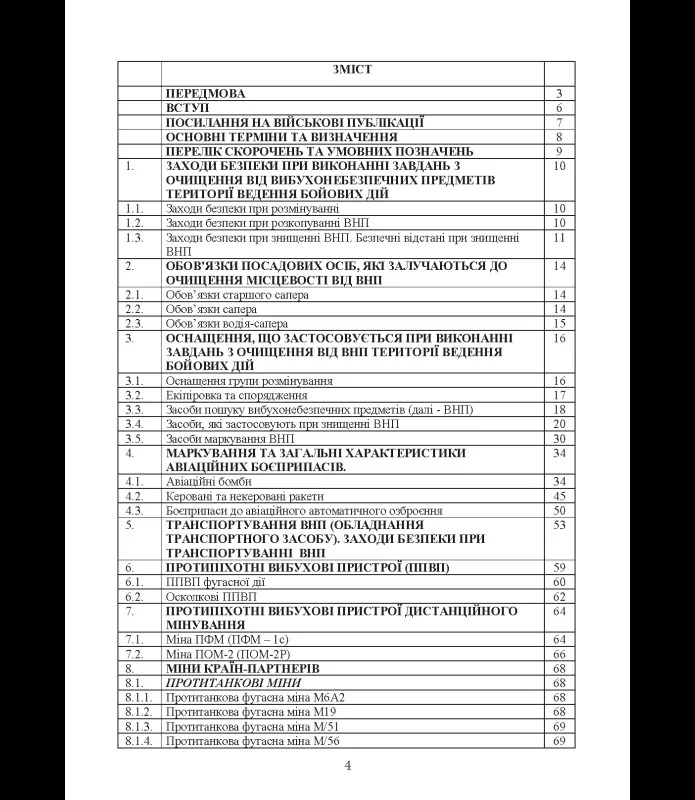 Окремі розділи присвячені бойовим частинам безпілотних літальних апаратів, підриванню елементів конструкцій, вузлам загороджень, підривним зарядам і системам розмінування. Видання містить уніфіковані терміни, скорочення, умовні позначення та посилання на чинні військові публікації.
