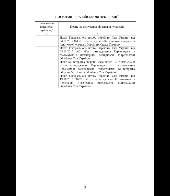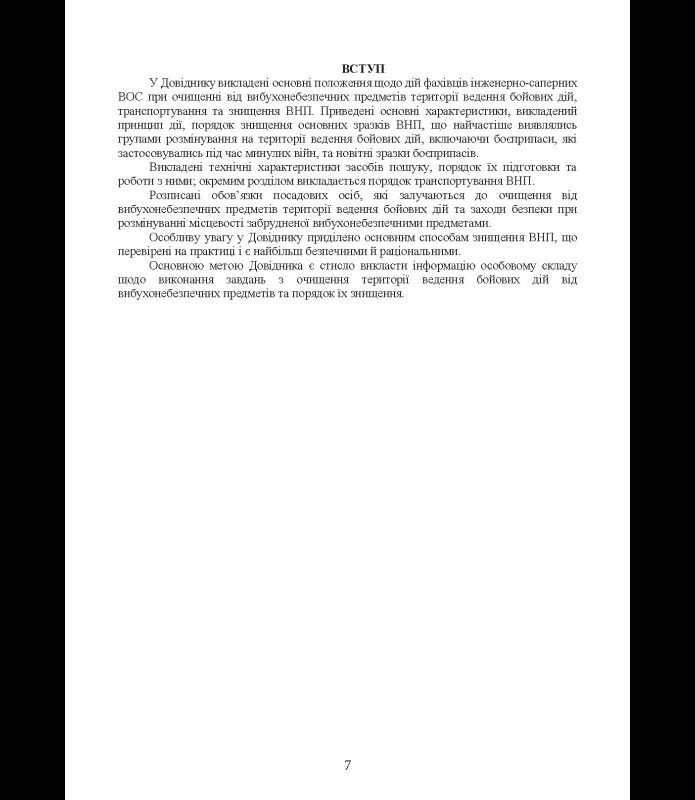 Ця навчально-методична публікація є комплексним практичним посібником для підготовки та повсякденної діяльності військовослужбовців інженерно-саперних підрозділів Збройних Сил України, а також інших сил безпеки й оборони, залучених до очищення місцевості від вибухонебезпечних предметів (ВНП) в умовах бойових дій.