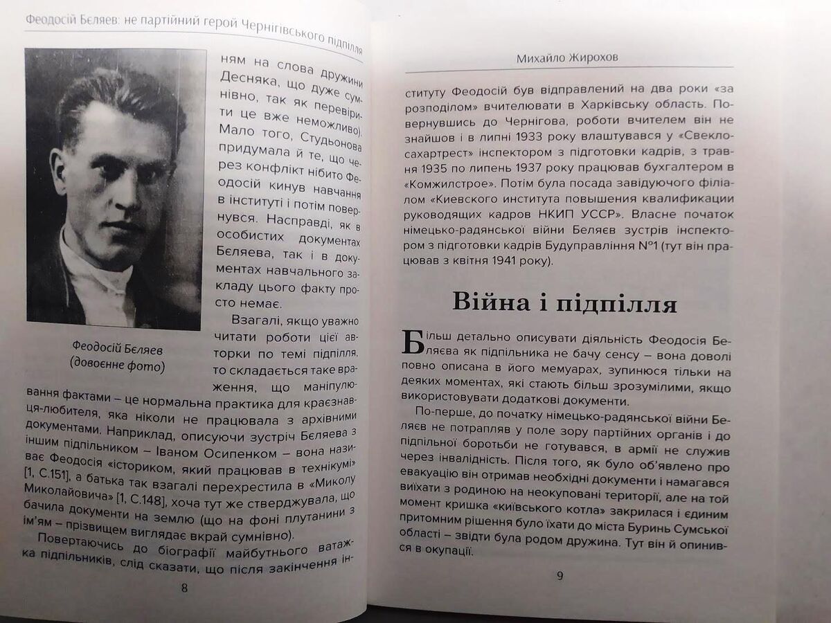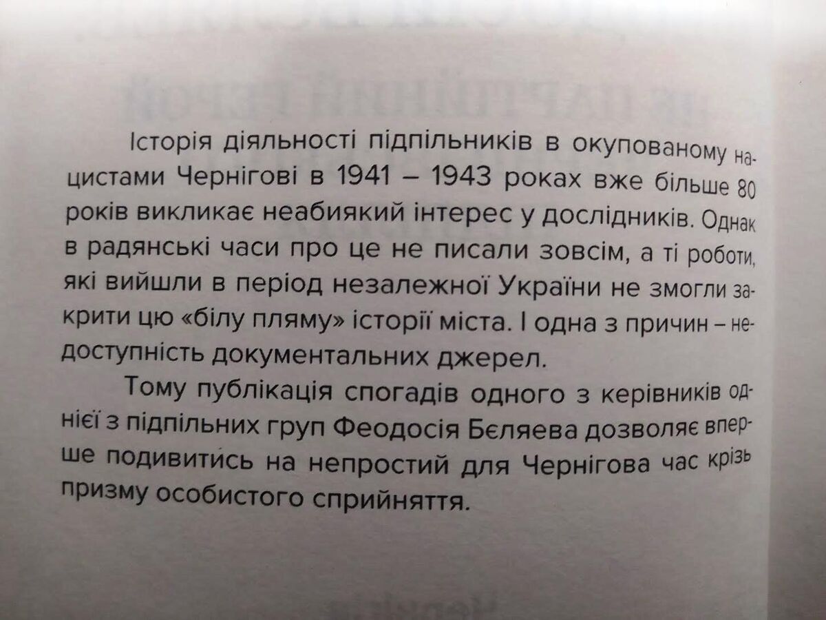 Поэтому публикация воспоминаний одного из руководителей одной из подпольных групп Феодосия Беляева позволяет впервые взглянуть на непростое для Чернигова время через призму личного восприятия.
