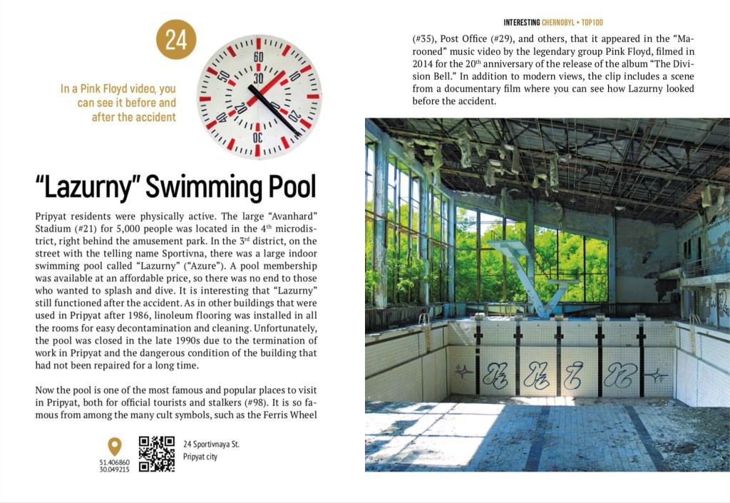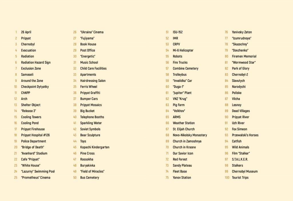 В этой книге собраны 100 увлекательных и в то же время лаконичных статей, рассказывающих о самых важных и интересных символах Чернобыльской зоны отчуждения: от, собственно, Чернобыльской атомной станции и города Припяти, до отдельных монументов ушедшей советской эпохи, автоматов с газированной водой, таксофонов и прочих объектов, дающих представление о жизни типичного успешного городка СССР 1980-х.