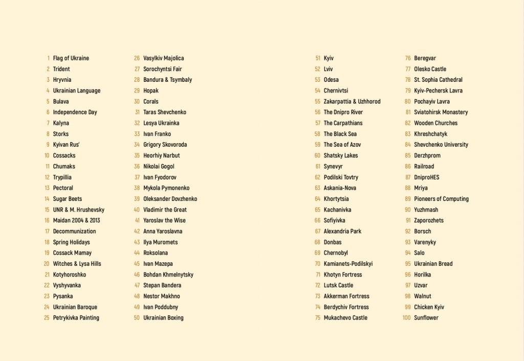В этой книге собраны 100 увлекательных статей о наиболее ярких символах Украины — от официальных, таких, как государственный герб и флаг, до «народных», таких, как борщ и горилка; главных украинских городах, ярких исторических личностях, самых популярных блюдах национальной кухни, народных промыслах, природных красотах, достижениях науки и техники.