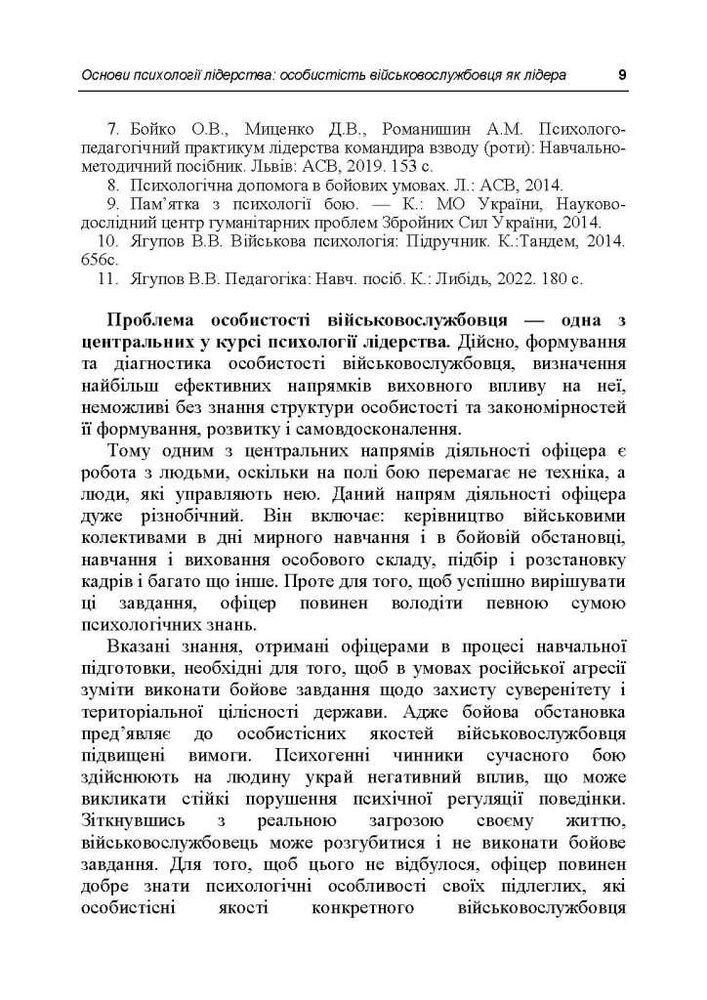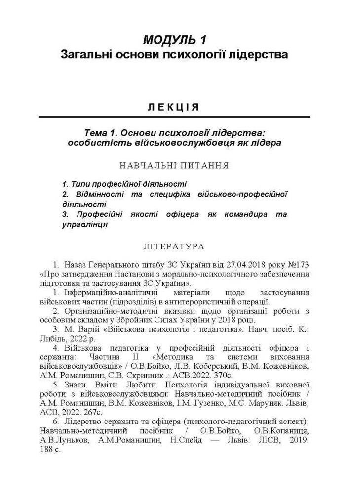 Курс лекций разработан на основе положений, изложенных в приказах и распоряжениях Министра обороны Украины и Главы Администрации Госспецтрансслужбы, организационно-методических указаний командующего Сухопутных войск Украины, Боевого устава СВ Украины на основе военного опыта выполнения задач по назначению в составе Сил обороны Украины, в соответствии с рабочей программой по дисциплине «Психология военного лидерства» В конспекте лекций предлагаются теоретически обоснованные и практически подтвержденные основные положения формирования и развития л В курсе лекций рассмотрены основы психологии лидерства в Вооруженных силах Украины и Госспецтрансслужбы, характеристика видов лидерства и способы их формирования.