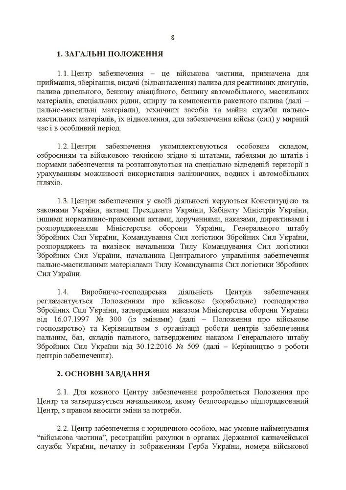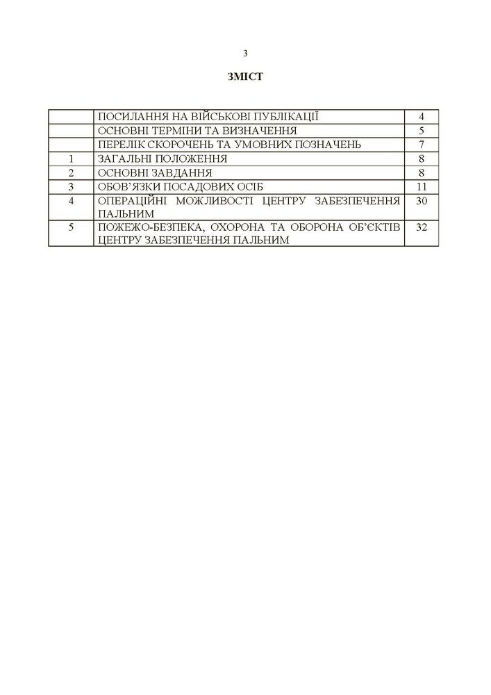 Цією Настановою визначаються вимоги щодо організації роботи складів пального та мастильних матеріалів (відокремлених відділів зберігання пального) об’єднаних центрів забезпечення, центрів (об’єднаних центрів) забезпечення пальним Збройних Сил України (далі — Центр забезпечення), експлуатації та розміщення технологічного обладнання, обов’язки посадових осіб за спеціалізацією тощо.