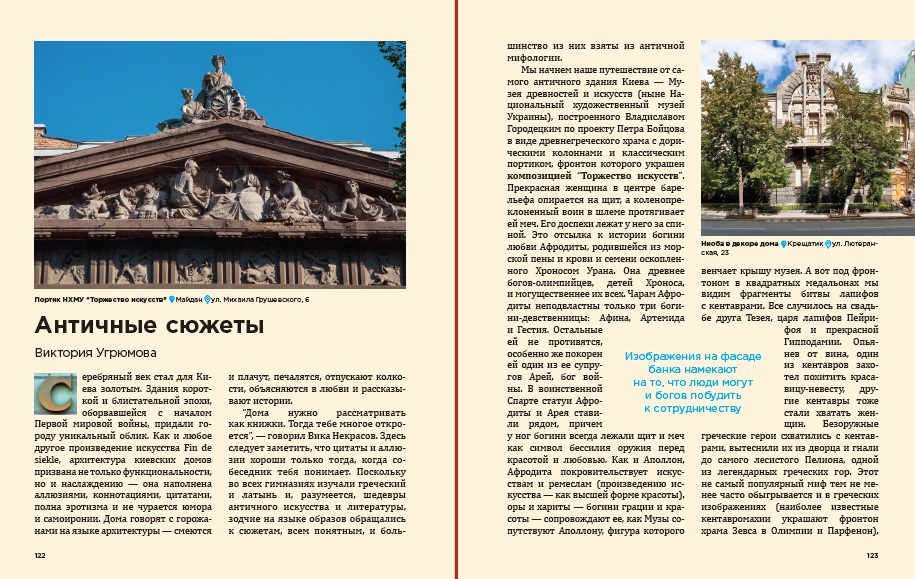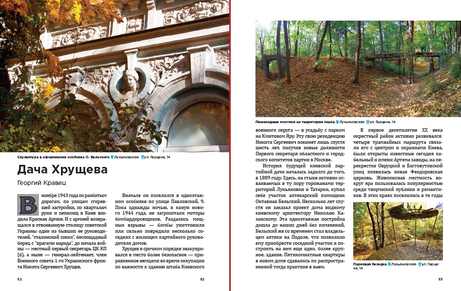 «Современный Киев — столица одного из государств Европы — из тех городов, с которым расстаешься неохотно, даже если находился в нем недолго. К нему быстро привыкаешь, как к чему-то очень родному и близкому. Обитая здесь многие годы, а то и всю жизнь, начинаешь любить и ценить не только то, чем гордится город перед всем миром, но и милые детали, которые открываются не сразу. Это тихие и уютные дворики старого города, незаметные, а то и вовсе скрытые от посторонних глаз скульптуры, элементы декора старинных зданий, фонтаны, беседки и многое другое, что придает очарование и дает возможность, пусть и на непродолжительное время, отдохнуть от повседневной мирской суеты мегаполиса.