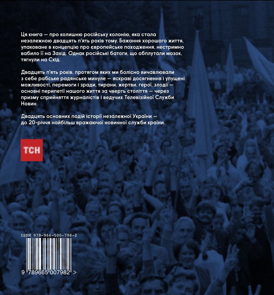 Двадцять п'ять років, упродовж яких ми болісно вичавлювали з себе рабське радянське минуле, яскраві досягнення й змарновані можливості, перемоги і зради, тирани, жертви, герої, злодії - основні перипетії нашого життя за чверть століття крізь призму сприйняття журналістів і ведучих Телевізійної служби новин.