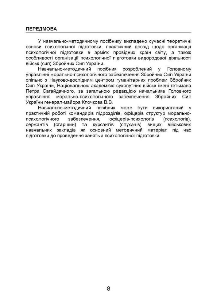 У навчально-методичному посібнику викладені теоретичні основи психологічної підготовки, представлений практичний досвід та особливості організації видородової діяльності військ (сил) Збройних Сил України.