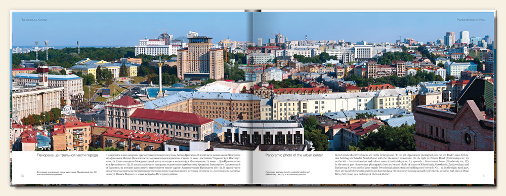 Тем, кто впервые посетил Киев, это издание позволит в течение короткого времени получить достаточно полное представление о новом для них городе. Обосновавшимся в Киеве недавно фотоальбом даст возможность ближе познакомиться со своим новым местом жительства, свободнее ориентироваться в сети его улиц и почувствовать себя более уютно в малознакомом мегаполисе. Что же касается киевских старожилов, то их, казалось бы, уже ничем нельзя удивить. Они досконально знают свой город не только «снизу», но и как он выглядит из космоса или корзины воздушного шара. Именно поэтому во время просмотра панорам родных penates, выполненных с непривычного ракурса, киевлянам «со стажем» не следует торопиться читать сопровождающий каждую панораму пояснительный текст, а, рассматривая ту или иную фотографию, попробовать без подсказки, самостоятельно узнать изображенные на ней районы, улицы, кварталы и дома. И пусть их не огорчает возможная неудача при попытке сделать это с первого взгляда, ведь Киев в последние десятилетия значительно видоизменился. Ушли в небытие некоторые дома и даже целые улицы. На их месте возникли «нахальные новички», основательно преобразившие с детства знакомый большинству киевлянам силуэт города, над созданием которого трудились многие талантливые зодчие прошлых столетий.