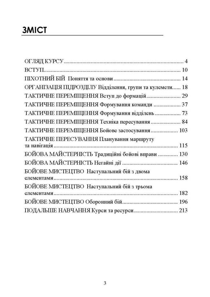 які допоможуть підрозділу здобути перемогу в бою. Замість того, щоб повторювати теми, які часто обговорюються в інших посібниках або школах, ця книга розглядає прогалини, які часто залишаються поза увагою піхотинців під час навчання. У книзі детально розглядаються такі теми, як формування команди/відділення, тактичне пересування, вибір маршруту, тактичне використання місцевості, вогонь і маневр.