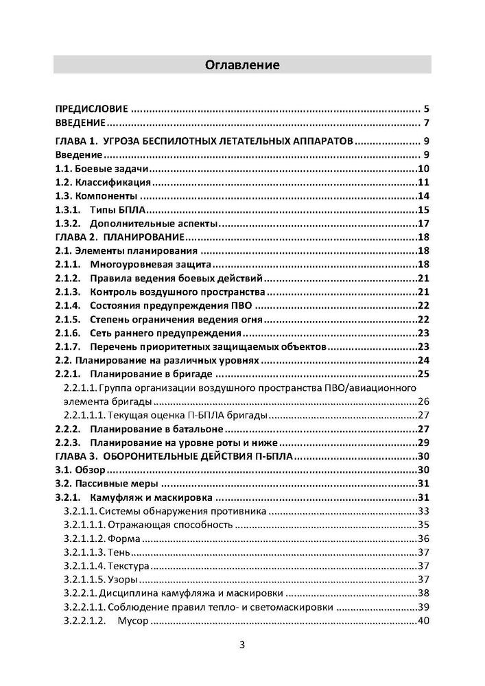 В наставлении рассмотрены действия и рекомендации на уровне бригад и ниже для обеспечения безопасности и противодействия разведке противника для лишения его беспилотных авиационных систем возможности выполнять свою боевую задачу. Оно включает описание угрозы беспилотных авиационных систем, как планировать в бригаде и ниже, оборонительные и наступательные действия для солдат и подразделений, ресурсы для дополнительной подготовки и пример оборудования противодействия беспилотным авиационным системам, которое может быть выдано подразделению или запрошено для использования.