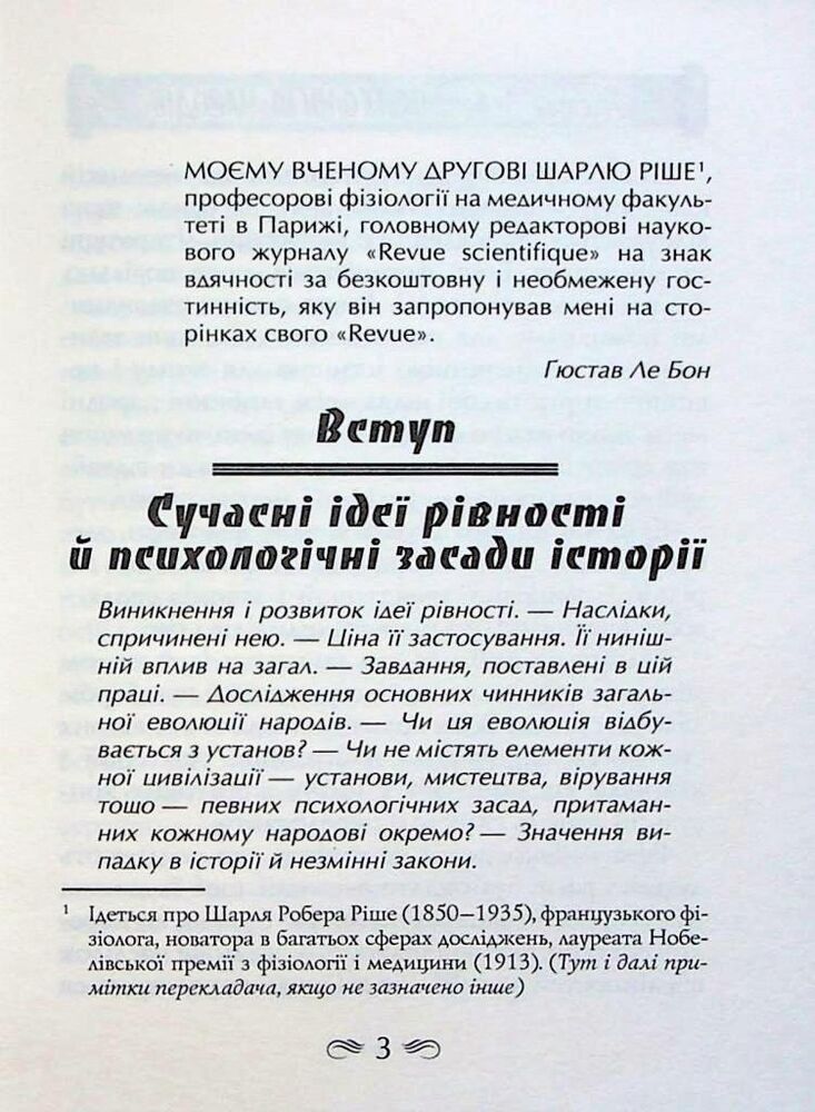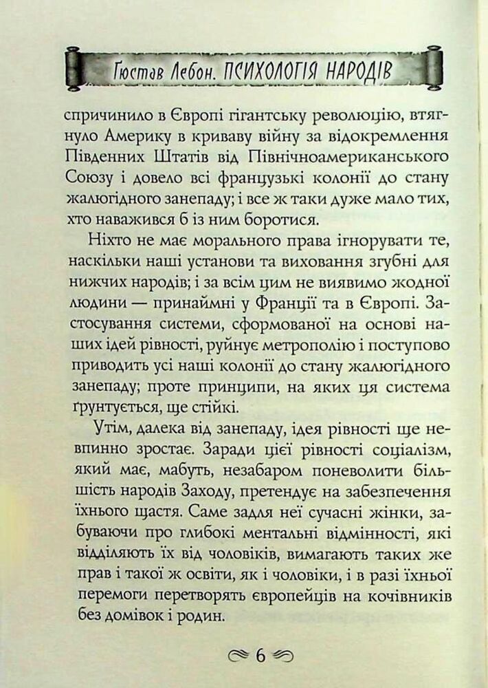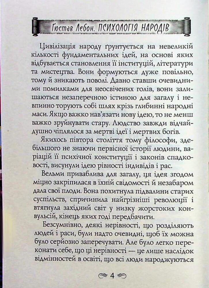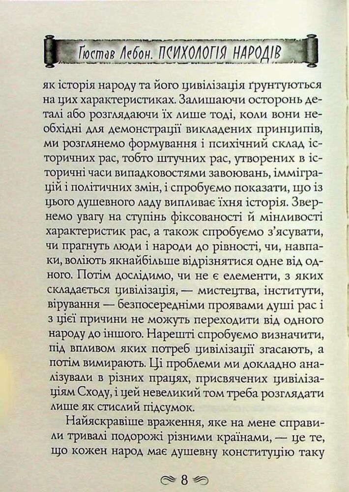 Видання містить одну з найбільш відомих книжок видатного французького психолога, соціолога, антрополога, лікаря та фізика Ґюстава Лебона (1841–1931) «Психологія народів» (1894). Попри те що автор зробив вагомий внесок у розвиток декількох наукових дисциплін, світ запам’ятав його саме завдяки працям з психології.