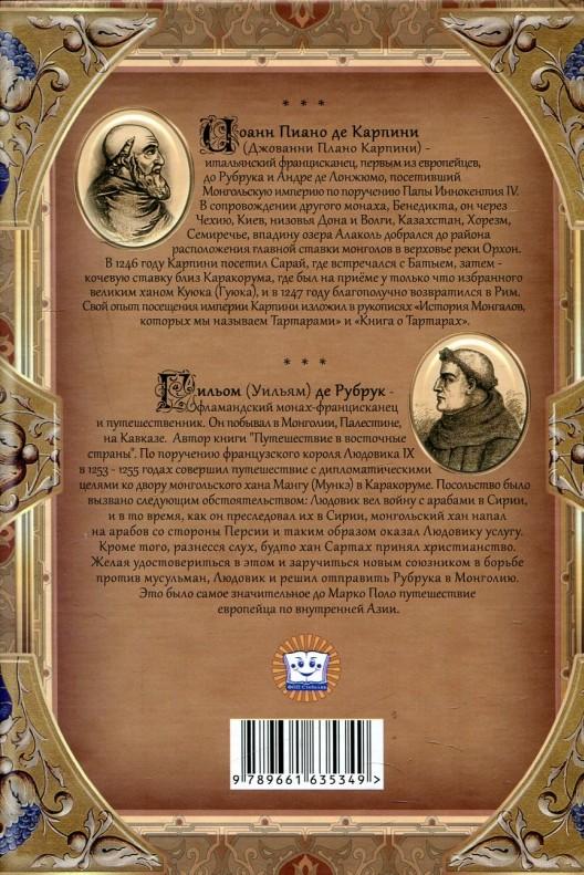 Настоящее издание содержит описание миссии брата Иоанна Пиано де Карпини составленное им самим, а также в устном изложении его спутника брата Бенедикта Поляка; описание путешествия в восточные части мира брата Уильяма Рубрука, монаха Ордена Миноритов и отдельные главы из произведения Морозова Н.А. "Новый взгляд на историю Русского государства".