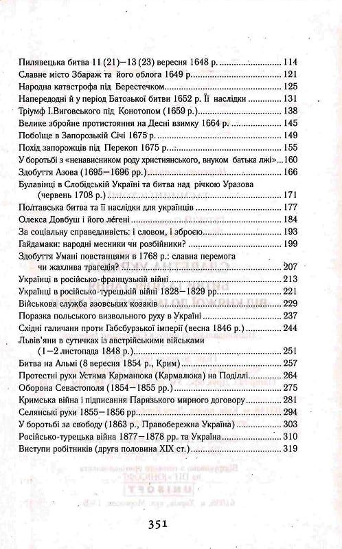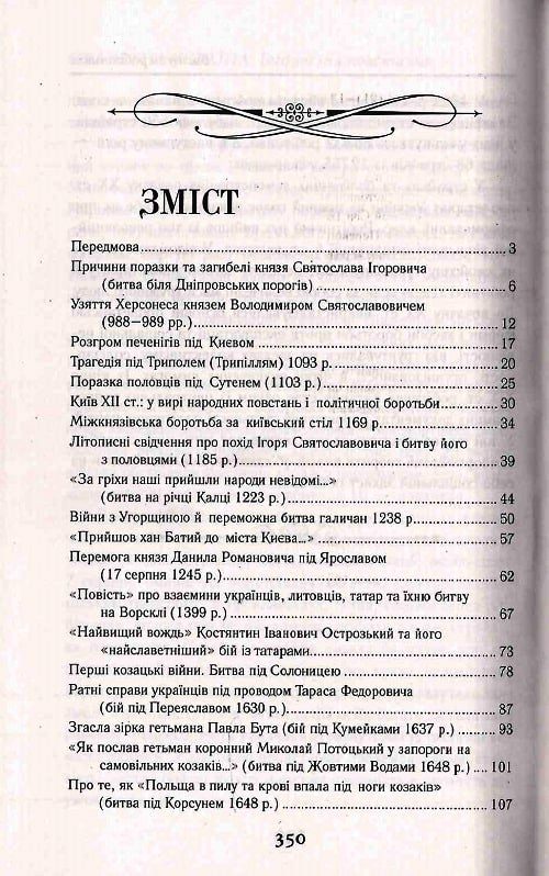 У книзі охоплено найвизначніші битви та повстання на території сучасної України, які відбувалися протягом X – початку XX століть. Невеликі за обсягом науково-популярні нариси розміщено за хронологічним принципом, що сприятиме кращому сприйняттю й осмисленню тогочасних подій. На основі документальних матеріалів і наукової літератури з’ясовано причини визначних перемог і прикрих поразок учасників збройних протистоянь, описано дії їхніх керівників — руських князів, козацьких і селянських ватажків, професійних військових того часу.