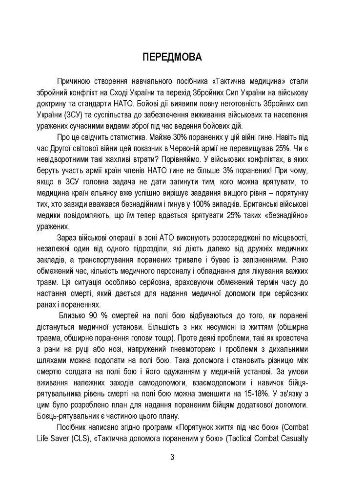 Навчальний посібник «Тактична медицина» призначений для підготовки студентів, які вивчають курс тактичної медицини на кафедрах військової підготовки ВНЗ немедичного напрямку, студентів медичних факультетів, лікарів-травматологів, хірургів, анестезіологів.