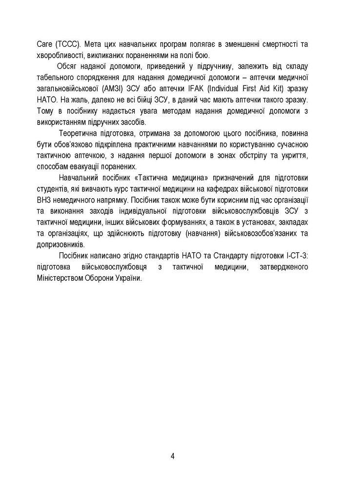 Посібник також може бути корисним під час організації та виконання заходів індивідуальної підготовки військовослужбовців з тактичної медицини у Збройних Сил України, інших військових формуваннях, а також в установах, закладах та організаціях, що здійснюють підготовку (навчання) військовозобов’язаних та допризовників.