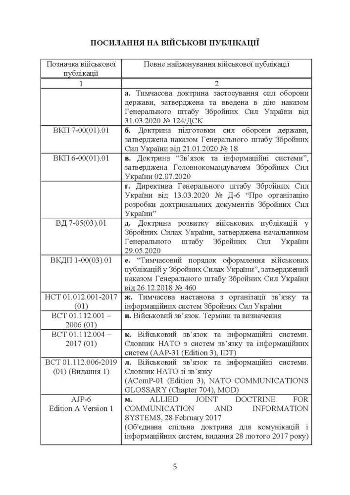 Для достижения оперативной и технической совместимости с государствами - членами НАТО стиль изложения основных положений настоящего Руководства соответствует положениям и структуре изложения и понятийному аппарату, используемому в союзной публикации НАТО AJP-6 (ссылка м). Этот документ является исходным для разработки установок видов и отдельных родов войск (сил) ВС Украины.