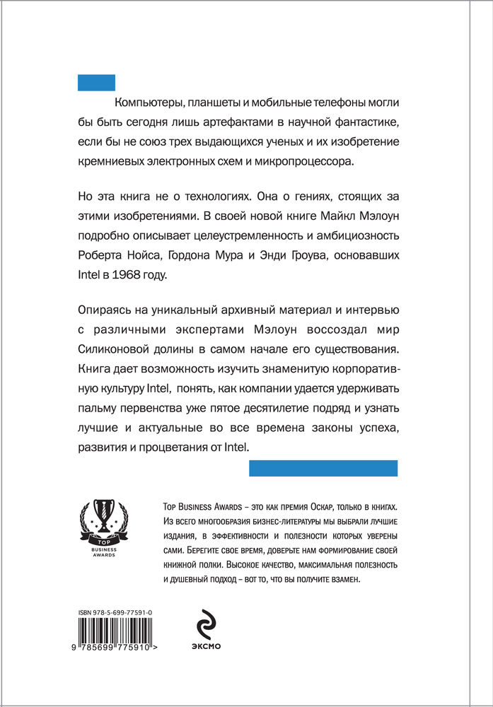 Компьютеры, планшеты и мобильные телефоны могли бы быть сегодня лишь артефактами в научной фантастике, если бы не союз трех выдающихся ученых и их изобретение кремниевых электронных схем и микропроцессора. Но эта книга не о технологиях. Это человеческая история о том, как каждый из этой троицы привнес в компанию то, без чего Intel никогда не стала бы самой влиятельной в мире компанией и не сделала бы возможными такие привычные вещи вроде персонального компьютера, интернета и телекоммуникаций. Это первая полная история корпорации Intel, рассказанная через описание жизненных путей трех самых важных для нее фигур. В своей книге Майкл Мэлоун подробно описывает целеустремленность и амбициозность Роберта Нойса, Гордона Мура и Энди Гроува, основавших Intel в 1968 году. Нойс дал компании деньги и надежность, Мур сделал ее технологическим лидером, а Гроув привел на вершину успеха.