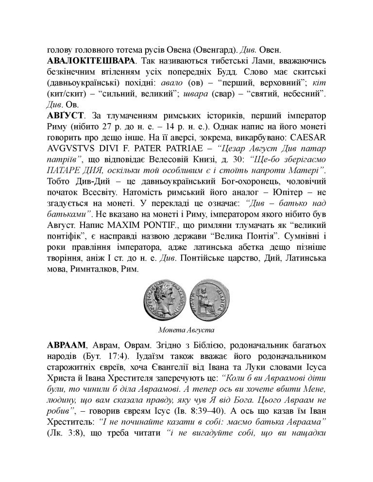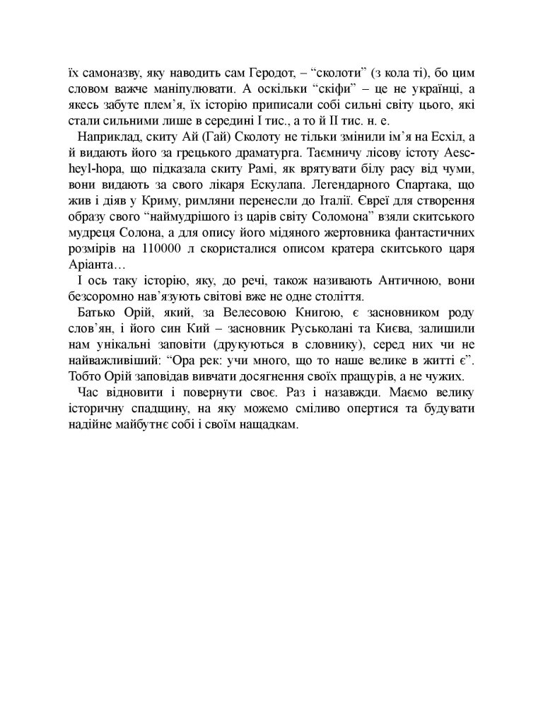Автор словника намагається хоча б частково відновити Веди, які, як свідчить Велесова Книга, були в нас украдені. Він повертає в українську історію сотні імен, подій, термінів, що їх привласнили інші народи. Розшифровує десятки текстів, написів на пам'ятниках, монетах, глечиках тощо — їх оминала наука або вважала набутком інших етносів.