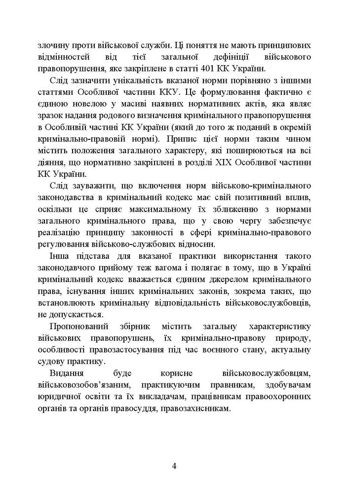 Пропонований збірник містить загальну характеристику військових правопорушень, їх кримінально-правову природу, особливості правозастосування під час воєнного стану, актуальну судову практику.