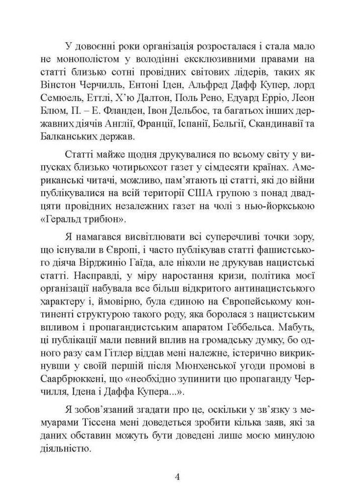 У мемуарах Фріца Тіссена розкрито основні механізми однієї з найпарадоксальніших світових криз, шокуючі подробиці проведення антиєврейської кампанії та впровадження системи концентраційних таборів, а також причини поразки Німеччини у Другій світовій війні. Сповідь розчарованого і підданого гонінням Тіссена зробила неоціненний внесок у викриття націоналсоціалістичного режиму і підвела підсумки жорстокого ідеологічного експерименту над німецьким народом.