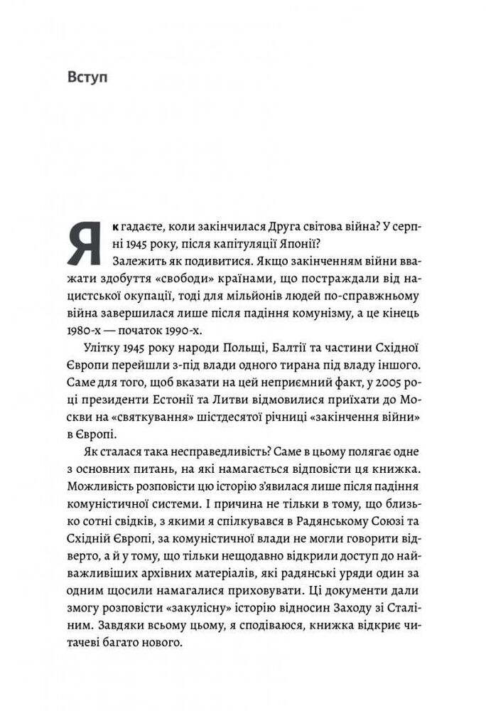 Кінець Другої світової війни мав принести «свободу» країнам, які постраждали від нацистської окупації, але для мільйонів людей вона не закінчилася до падіння комунізму. Влітку 1945 року багато країн Східної Європи просто змінили владу одного тирана, Адольфа Гітлера, на владу іншого — Йосипа Сталіна. Серед них і Україна. Чому так сталося? Це залишається одним з найбільш тривожних питань світової історії і лежить в основі дослідження Лоренса Ріса.